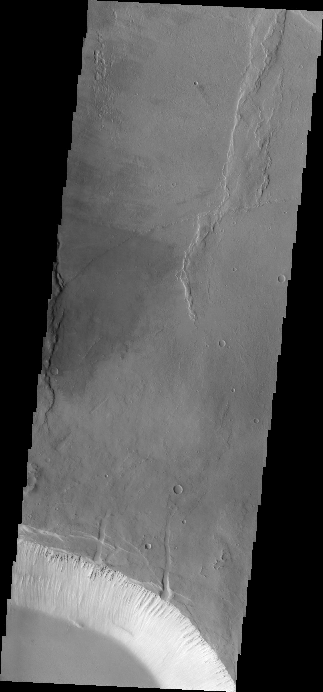 This image shows part of the two summit calderas of Pavonis Mons. The surface in the majority of the image is the floor of the larger caldera. The smaller caldera occupies the bottom of the image. In both calderas the floor is predominately flat. The final summit flow would have pooled in the caldera and cooled forming the flat floor.