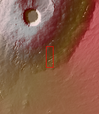 This image shows part of the southeastern flank of Pavonis Mons. Surface lava flows run down hill from the top left of the image to the bottom right. Perpendicular to that trend are several linear features. These are faults that encircle the volcano and also run along the linear trend through the three Tharsis volcanoes. This image illustrates how subsurface lava tubes collapse into the free space of the empty tube. Just to the top of the deepest depression are a series of circular pits. The pits coalesce into a linear feature near the left side of the deepest depression. The mode of formation of a lava tube starts with a surface lava flow. The sides and top of the flow cool faster than the center, eventually forming a solid, non-flowing cover of the still flowing lava. The surface flow may have followed the deeper fault block graben (a lower surface than the surroundings). Once the flow stops there remains the empty space lower than the surroundings, and collapse of the top of the tube starts in small pits which coalesce in the linear features.