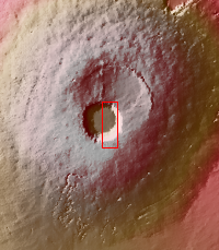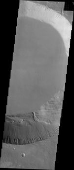 This image shows part smaller summit caldera of Pavonis Mons. This caldera is approximately 5km deep. Near the bottom of the image is a region where part of the caldera side has collapsed into the bottom of the caldera. In shield volcanoes calderas are typically formed where the surface collapses into the void formed by an emptied magma chamber.