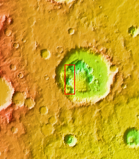 Rabe Crater is 108 km (67 miles) across. Craters of similar size often have flat floors. Rabe Crater has some areas of flat floor, but also has a large complex pit occupying a substantial part of the floor. The interior fill of the crater is thought to be layered sediments created by wind and or water action. The pit is eroded into this material. The eroded materials appear to have stayed within the crater forming a large sand sheet with surface dune forms as well as individual dunes where the crater floor is visible. The dunes also appear to be moving from the upper floor level into the pit.