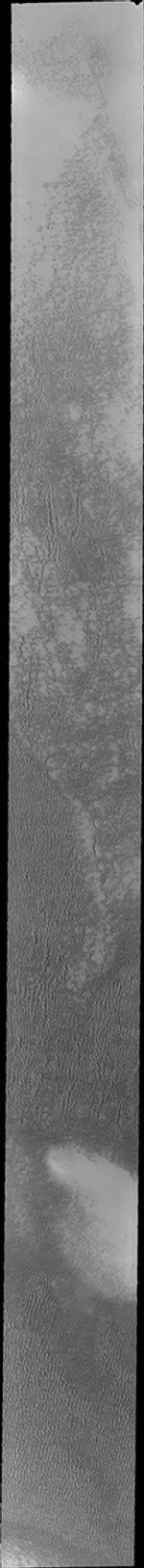 Siton Undae is a large dune field located in the northern plains near Escorial Crater. Siton Undae is west of the crater and is one of three dune fields near the crater. The nearby north polar cap is dissected by Chasma Boreale, which exposes an ice free surface. This image was collected during early spring in the northern hemisphere. The bright appearance of the dunes is due to frost cover. As the season progresses the dunes become darker as the frost disappears.