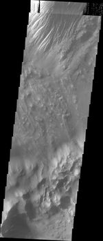 This VIS image shows part of the floor of Tithonium Chasma. Eroded materials cover most of the image. The initial formation of layered floor deposits was possibly created of air fall of dust, sand, and volcanic materials and water lain materials. The weathering of these deposits is probably by the wind. The bottom part of the image has complex, hummocky material, probably very old landslide deposits. At the top of the image is a large mound of material that has been eroded mainly by wind action. The overlapping of these surfaces indicates a long history of modication of Tithonium Chasma.