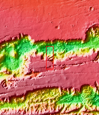 Tithonium Chasma has numerous large landslide deposits. At the bottom of this VIS image is the high plateau between Tithonium Chasma and Ius Chasma (off the bottom of the frame). The resistant material of the plateau surface forms the linear ridges of the canyon wall. Erosion of the walls cover the lower slopes. Large landslides have changed the walls and floor of the canyon. A landslide is a failure of slope due to gravity. They initiate due to several reasons. A lower layer of poorly cemented/resistant material may have been eroded, undermining the wall above which then collapses; earth quake seismic waves can cause the slope to collapse; and even an impact event near the canyon wall can cause collapse. As millions of tons of material fall and slide down slope a scalloped cavity forms at the upper part where the slope failure occurred. At the material speeds downhill it will pick up more of the underlying slope, increasing the volume of material entrained into the landslide. As the landslide material reaches the canyon bottom it spreads out and eventually comes to rest. The edge of the deposit is lobate, and may be affected by running up against pre-existing features on the canyon floor. Most Martian landslide have radial grooves on the slide surface.