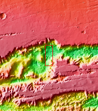 Tithonium Chasma is at the western end of Valles Marineris. Valles Marineris is over 4000 kilometers long, wider than the United States. Tithonium Chasma is almost 810 kilometers long (499 miles), 50 kilometers wide and over 6 kilometers deep. In comparison, the Grand Canyon in Arizona is about 175 kilometers long, 30 kilometers wide, and only 2 kilometers deep. The canyons of Valles Marineris were formed by extensive fracturing and pulling apart of the crust during the uplift of the vast Tharsis plateau. Landslides have enlarged the canyon walls and created deposits on the canyon floor. Weathering of the surface and influx of dust and sand have modified the canyon floor, both creating and modifying layered materials.