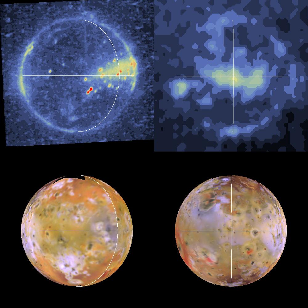 Shown here are color-coded images of Io in eclipse (top). The images were acquired by NASA's Galileo spacecraft during its tenth orbit around Jupiter. The corresponding views of Io in reflected light are shown at the bottom. The white lines delimit Io's equator and longitudes of 0 (left) and 180 degrees (right). Io always keeps the same hemisphere (longitude 0) facing Jupiter, just as the nearside of the Moon always faces Earth. Furthermore, Io is not a perfect sphere; it is elongated along the axis which is radial to Jupiter (the "a" axis). The solid-body tides on Io have the greatest amplitude (about 50 meters) where the a axis intersects the surface, at the sub-Jupiter point (latitude 0, longitude 0) and at the anti-Jupiter point (latitude 0, longitude 180 degrees).