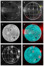 (A): In this picture from the Long-Range Reconnaissance Imager (LORRI), dark blotches and straight lines are artifacts. The brightest spots (including the volcanoes Pele [P] and East Girru [EG]) are incandescent lava from active volcanoes. The more diffuse glows, and the many faint spots, are from gas in the plumes and atmosphere, glowing due to bombardment by plasma in Jupiter's magnetosphere, in a display similar to the Earth's aurorae. (B): The same image with a latitude/longitude grid, showing that the cluster of faint spots is centered near longitude 0 degrees, the point on Io that faces Jupiter. The image also shows the locations of the plumes seen in sunlit images (indicated by red diamonds), which glow with auroral emission in eclipse. (C): Simulated sunlit view of Io with the same geometry, based on sunlit LORRI images. (D): A combination of the sunlit image (in cyan) and the eclipse image (in red), showing that all point-like glows in the eclipse image arise from dark volcanoes in the eclipse image. (E): This infrared image, at a wavelength of 2.3 microns, obtained by New Horizons Linear Etalon Spectral Imaging Array (LEISA) an hour after the LORRI image, showing thermal emission from active volcanoes. Elongation of the hot spots is an artifact. (F): Combined visible albedo (cyan) and LEISA thermal emission (red) image, showing the sources of the volcanic emission. That most of the faint point-like glows near longitude zero, seen in visible light in images A, B, and D, do not appear in the infrared view of volcanic heat radiation, is one reason scientists believe that these glows are due to auroral emission, not heat radiation.