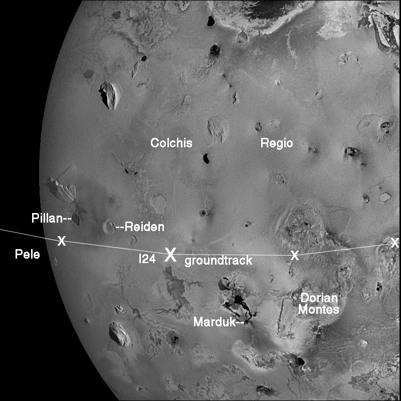 During its 14th orbit of Jupiter in March 29, 1998, NASA's Galileo spacecraft captured an image of Jupiter's moon, Io, that has the same lighting geometry that will exist during Io's close Io flyby on October 11, 1999 (the 24th orbit). The spacecraft groundtrack on Io is shown, with two-minute intervals marked by X's. The large X marks the location of closest approach, when Galileo will be just 500 kilometers (about 300 miles) above Io's surface. The curved boundary on the left marks the "terminator" or boundary between the lit day side and dark night side. Although the Pele volcano will be on the night side during the flyby, the hot lavas will be seen glowing in the dark. Other targets of interest that will be visible near closest approach are Pillan Patera, the site of dramatic surface changes, Reiden Patera, Marduk, the bright plains of Colchis regio, and the rugged Dorian Montes mountains. Active volcanic plumes and high-temperature hot spots have been seen at Pele, Pillan, and Marduk.