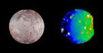 The infrared image uses false color to portray the intensity with which the surface glows at the invisible wavelength of 5 microns, as observed by Galileo's near infrared mapping spectrometer instrument. White, reds and yellows indicate hotter regions; blues are cold. The resolution varies from 83 to 93 kilometers (52 to 58 miles) per picture element.