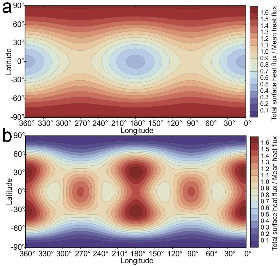 Figure B shows surface heat concentrations at the equator if heating occurs primarily within Io's shallower asthenosphere.