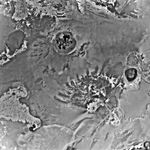 This Voyager 1 view of an equatorial region near longitude 300 degrees shows several large surface flows that originate in volcanic craters or calderas. At the right edge is a light flow about 250 kilometers long. Another dark, lobate flow with bright edges is just left of center, with an exceedingly dark caldera to its left.