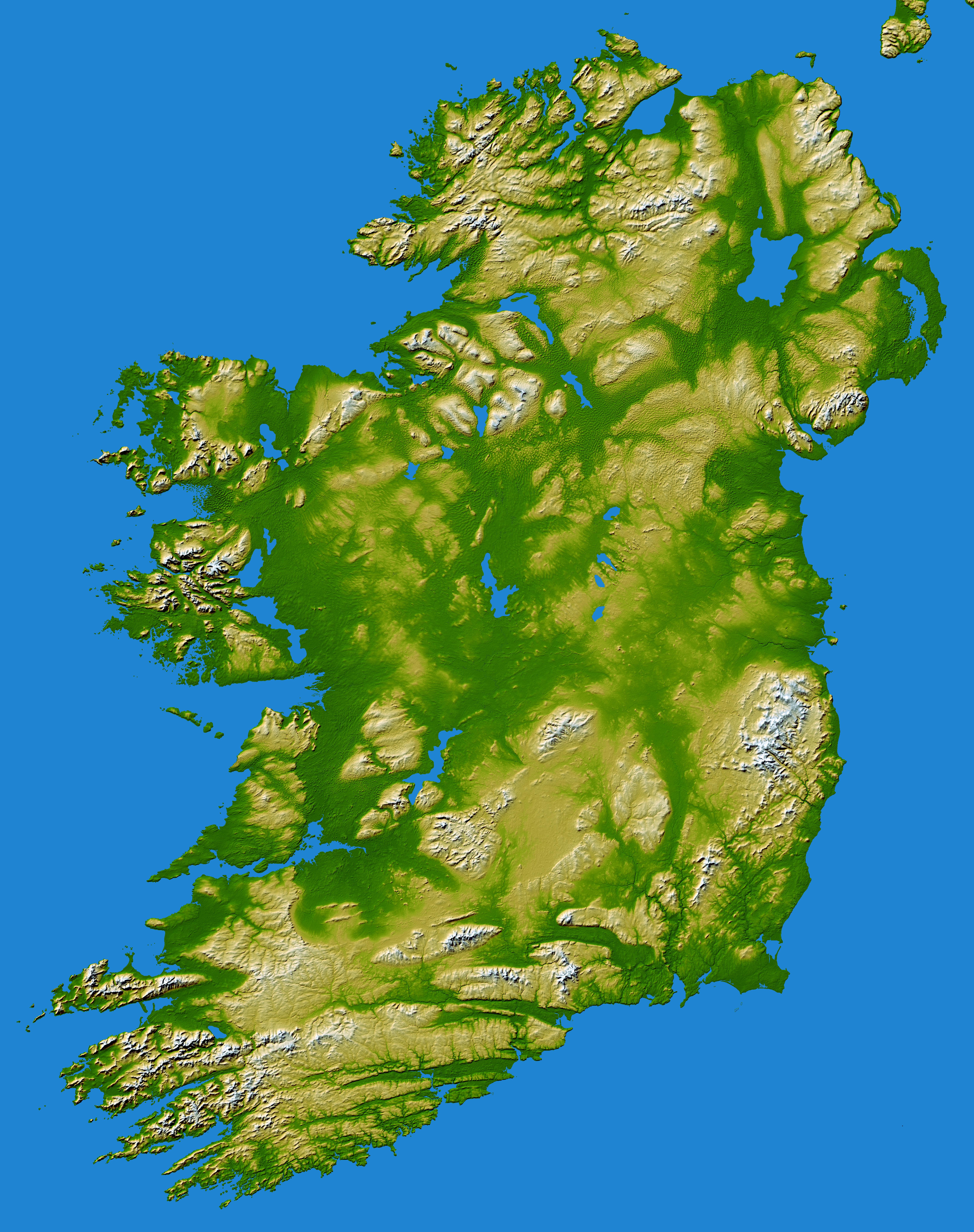 The island of Ireland comprises a large central lowland of limestone with a relief of hills surrounded by a discontinuous border of coastal mountains which vary greatly in geological structure. The mountain ridges of the south are composed of old red sandstone separated by limestone river valleys. Granite predominates in the mountains of Galway, Mayo and Donegal in the west and north-west and in Counties Down and Wicklow on the east coast, while a basalt plateau covers much of the north-east of the country. The central plain, which is broken in places by low hills, is extensively covered with glacial deposits of clay and sand. It has considerable areas of bog and numerous lakes. The island has seen at least two general glaciations and everywhere ice-smoothed rock, mountain lakes, glacial valleys and deposits of glacial sand, gravel and clay mark the passage of the ice.