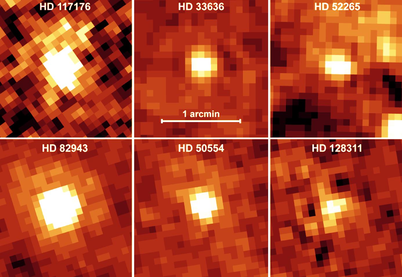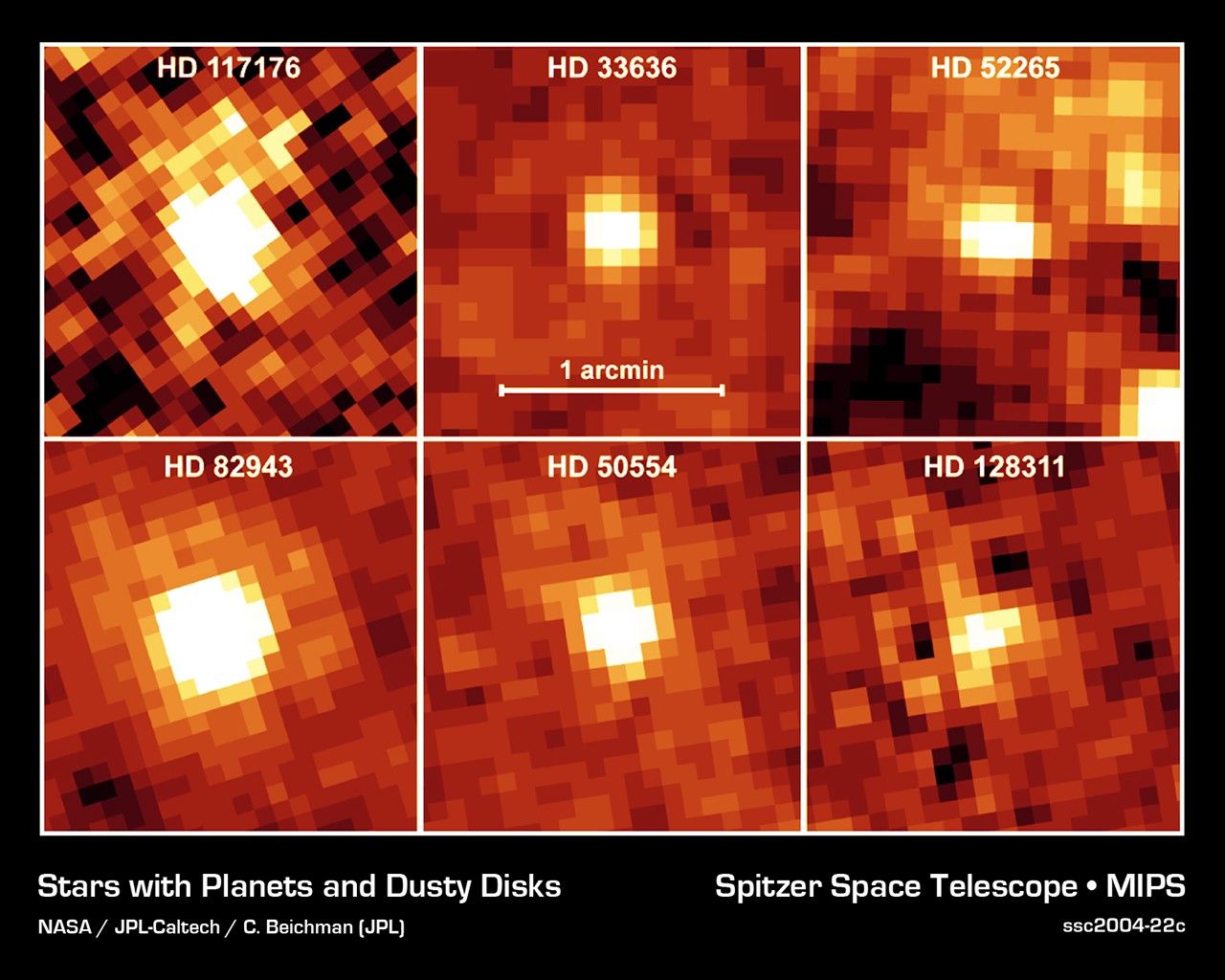 NASA's Spitzer Space Telescope recently captured these infrared images of six older stars with known planets. The yellow, fuzzy blobs are stars circled by disks of dust, or "debris disks," like the one that surrounds our own Sun. Though astronomers had predicted that stars with planets would harbor debris disks, they could not detect such disks until now.