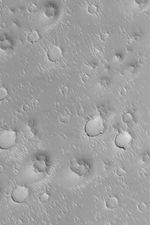 Isidis Planitia is a vast, nearly circular plain centered at 12°N, 273°W. Its circular shape has led Mars researchers to suspect that it is the site of a very ancient, very eroded basin formed by asteroid or comet impact when the planet was still very young. This Mars Global Surveyor (MGS) Mars Orbiter Camera (MOC) image shows a 3 km (1.9 mi) wide view of a typical Isidis Planitia scene. All over Isidis Planitia are found craters, ripple-like, light-toned, windblown dunes, and rugged mounds with summit pits. The mounds with summit pits might mark the location of impact craters that formed in a layer of material that used to cover much of Isidis Planitia, but has been largely stripped away, leaving the floors of former impact craters standing high upon remnants of this formerly more extensive layer. This example is located near 18.2°N, 272.5°W, and is illuminated by sunlight from the lower left.