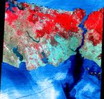 This June 16, 2000 image of Istanbul, Turkey show a full 60 by 60 km ASTER scene in the visible and infrared channels. Vegetation appears red, and urban areas blue-green. Bustling Istanbul, with its magnificent historical heritage, has spanned the divide between Europe and Asia for more than 2,500 years. Originally called Byzantium, the city was founded in the 7th century BC on the Golden Horn, an arm of the narrow Bosporus (also spelled Bosphorus) Strait, which connects the Sea of Marmara to the south, with the Black Sea to the north. Constantine I made it his capital of the Eastern Roman Empire in AD 330. As Constantinople, the strategically located city arose as the preeminent cultural, religious, and political center of the Western world. It reached the height of its wealth and glory in the early 5th century. After centuries of decline, the city entered another period of tremendous growth and prosperity when, as Istanbul, it became the capital of the Turkish Ottoman Empire in 1457. Although Turkey moved its capital to Ankara in 1923, Istanbul remains the nation's largest city with a population of over 8 million, its commercial center, and a major port. Two bridges spanning the Bosporus, and ships in the busy channel can be seen on the enlargement. On the image, the water areas have been replaced with a thermal image: colder waters are displayed in dark blue, warmer areas in light blue. Note the dark lines showing boat wakes, and the cold water entering the Sea of Marmara from deeper waters of the Bosporus.