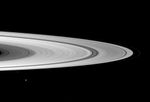 Those with a careful eye may be able to see Pan (28 kilometers, or 17 miles across) cutting through the thin black line of the Encke Gap. Pan and Helene have both been brightened to make them visible, but they each only comprise one pixel in the image. Helene (33 kilometers, or 21 miles across) is located at the bottom of the image, to the left of the vertical center.