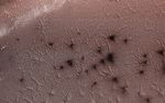 But these aren't actual spiders. Called "araneiform terrain," describes the spider-like radiating mounds that form when carbon dioxide ice below the surface heats up and releases. This is an active seasonal process not seen on Earth. Like dry ice on Earth, the carbon dioxide ice on Mars sublimates as it warms (changes from solid to gas) and the gas becomes trapped below the surface.