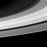 From beneath the ring plane, the small, irregularly shaped moon Janus (181 kilometers, or 112 miles, across) can be seen following the orbital path it shares with slightly smaller Epimetheus (116 kilometers, or 72 miles, across).