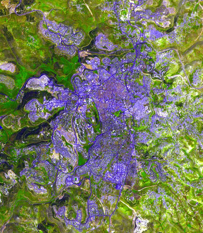 This ASTER sub-image was acquired on April 3, 2000 and covers an area of 10.5 x 12 km centered on Jerusalem. The data were processed to create a simulated natural color image, with green vegetation and orange tile roofs. The old city is the lighter blue area in the right center of the image, surrounded by a 400-year-old wall built by the Ottoman Turks. Easily visible are the Dome of the Rock and the Al Aksa Mosque on the eastern side of the old city. Jerusalem is the source of three major religions—Judaism, Christianity, and Islam—and is considered holy by all three. The image is located at 31.7 degrees north latitude and 35.2 degrees east longitude.