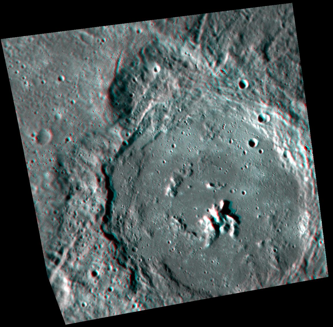 Joplin crater stands out brilliantly in 3D. With red-cyan glasses, you get an amazing view of Joplin's central peak, which rises around 1 km (0.6 mi.) above the crater floor. This picture has been rotated so that north is toward the bottom to enhance the 3D effect.