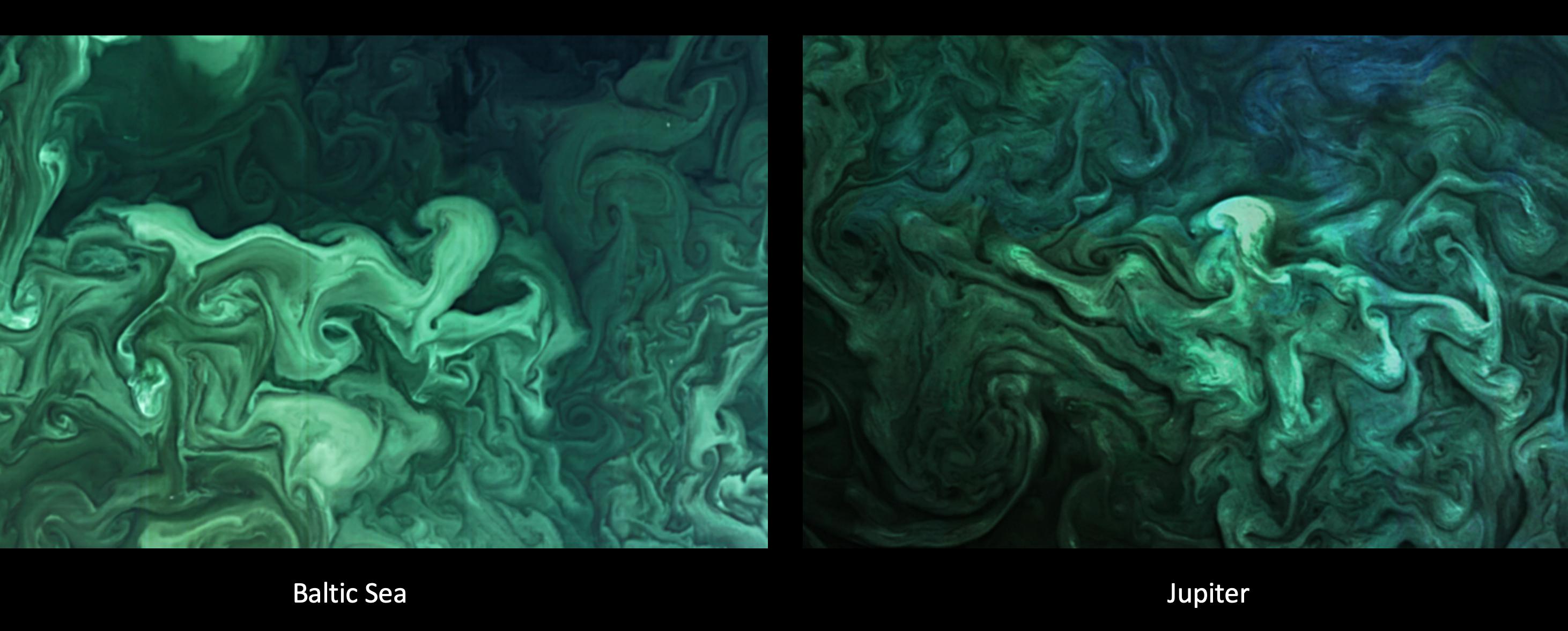 The left image shows a close-up of a phytoplankton blooming in the southern Gulf of Bothnia, in the Baltic Sea, between Sweden and Finland on April 14, 2019. The right image shows turbulent clouds in Jupiter's atmosphere.