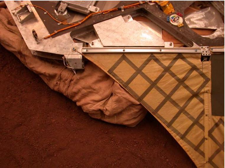 This image shows the deflated airbags retracted underneath the lander petal at the JPL In-Situ Instrument Laboratory. Retracting the airbags helps clear the path for the rover to roll off the lander and onto the martian surface.