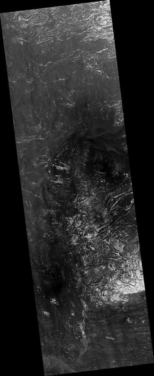 This part of Melas Chasma has been the target for many previous HiRISE images due to its diversity of terrains and materials. This observation covers an area not previously imaged, revealing a chaotic jumble of bright layered sediments, perhaps resulting from large landslides.