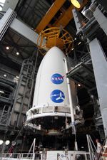 At Space Launch Complex 41, the Juno spacecraft, enclosed in an Atlas payload fairing, was transferred into the Vertical Integration Facility where it was positioned on top of the Atlas rocket stacked inside.