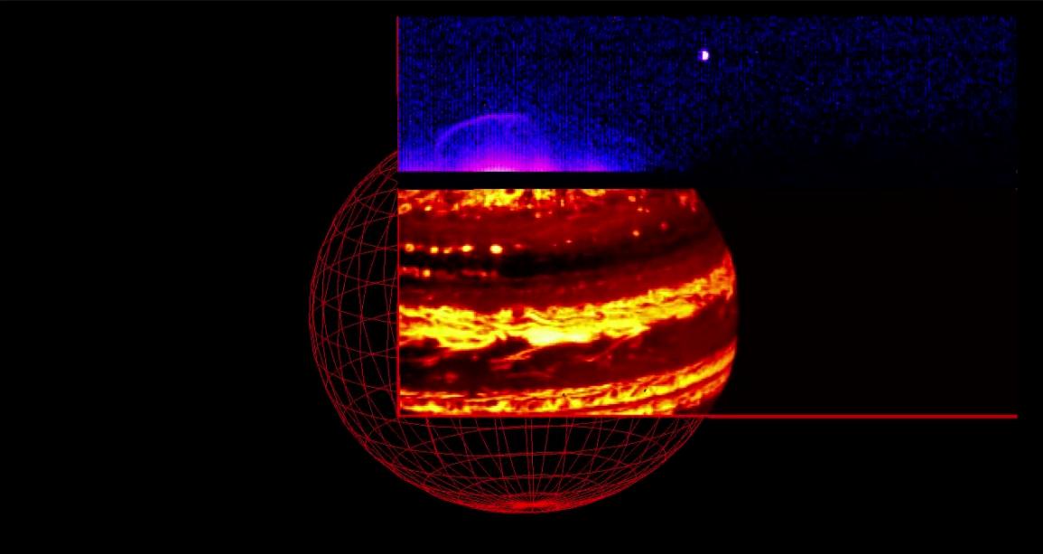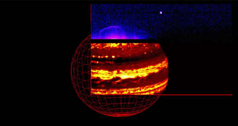 The video shows the two parts composing the JIRAM imager: the lower one, in a red color scale, is used for mapping the planet's thermal emission at wavelengths around 4.8 microns; the upper one, in a blue color scale, is used to map the auroras at wavelengths around 3.45 microns.