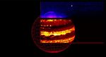 In this case the exposure time of the imager was optimized to observe the planet's thermal emission. However, it is possible to see a faint aurora and Jupiter's moon Io approaching the planet. The Great Red Spot is also visible just south of the planet's equator.