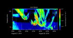 This video displays these radio emissions in a format similar to a voiceprint, showing the intensity of radio waves as a function of frequency and time. The largest intensities are indicated in warmer colors.