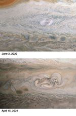 Many features in Jupiter's highly dynamic atmosphere are short lived, but the April 2021 observation from the JunoCam instrument (lower image) revealed that nearly one year after its discovery, the remnant of Clyde's Spot had not only drifted away from the Great Red Spot but had also developed into a complex structure that scientists call a folded filamentary region. This region is twice as big in latitude and three times as big in longitude as the original spot, and has the potential to persist for an extended period of time.