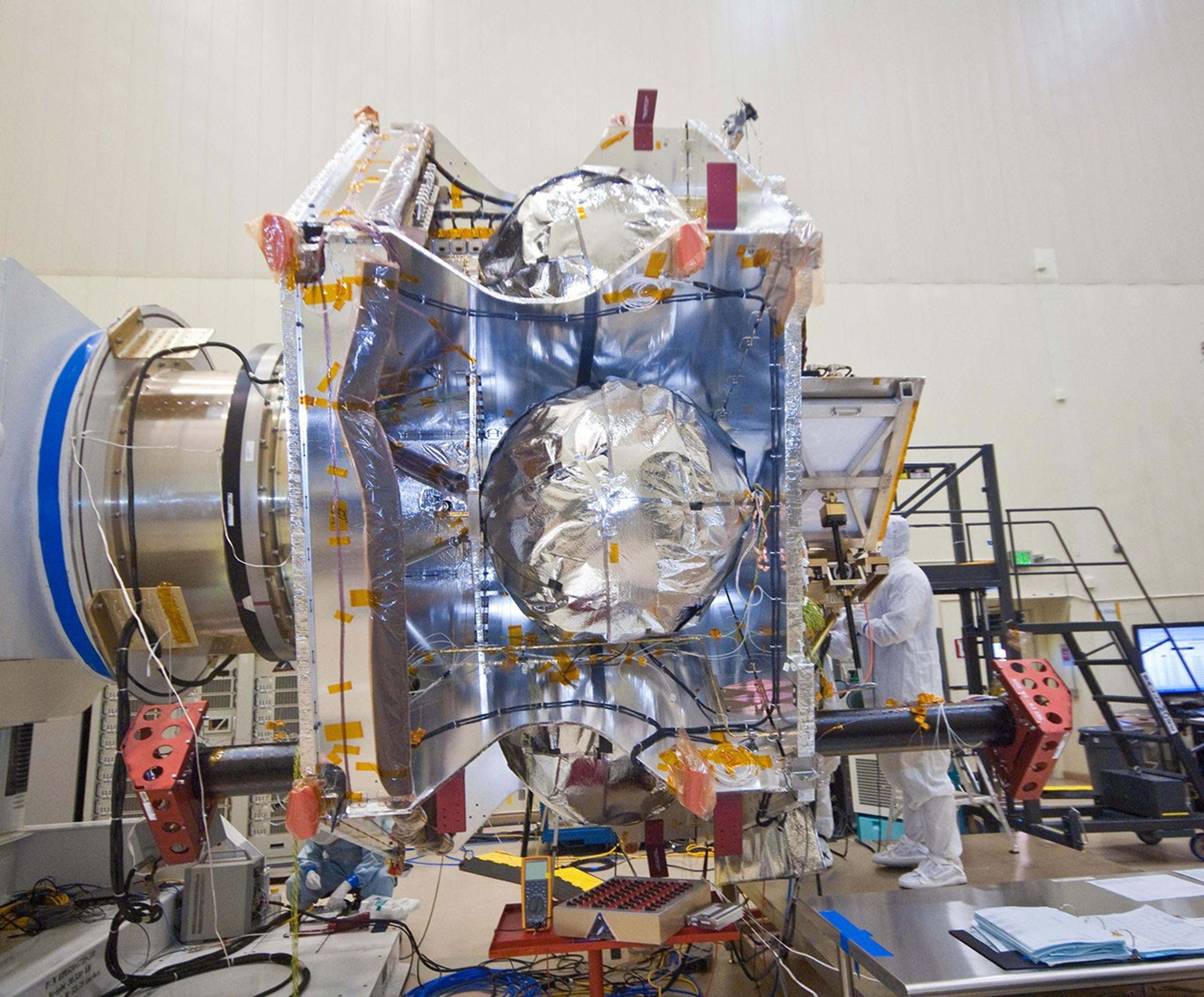 This image was taken on June 29, 2010, in the high-bay cleanroom at Lockheed Martin Space Systems in Denver. Here, the spacecraft is mounted on a large rotation fixture which allows the spacecraft to be turned for convenient access for integration and testing of various subsystems.