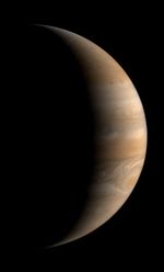 This crescent view of Jupiter was taken by Voyager 1 on March 24, 1979. This image was taken through three color filters and recombined to produce the color image. This photo was assembled from three black and white negatives by the Image Processing Lab at Jet Propulsion Laboratory. JPL manages and controls the Voyager project for NASA's Office of Space Science.