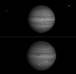 Europa, a satellite of Jupiter about the size of Earth's Moon, is visible to the left of Jupiter in the upper image, and in front of the planet in the lower image. Another of Jupiter's Galilean satellites, Ganymede, which is larger than the planet Mercury, is to the right in the upper image, with brightness variations visible across its surface. In the upper image, Europa is caught entering Jupiter's shadow, and hence appears as a bright crescent; in the lower image, it is seen about one-and-a-half orbits later, in transit across the face of the planet. Because there is neither methane nor any strong absorber in this spectral region on the surface of Europa, it appears strikingly white and bright compared to Jupiter.