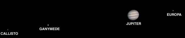 Jupiter/Galilean Satellites: When Galileo first turned his telescope toward Jupiter four centuries ago, he saw that the giant planet had four large satellites, or moons. These, the largest of dozens of moons that orbit Jupiter, later became known as the Galilean satellites. The larger two, Callisto and Ganymede, are roughly the size of the planet Mercury; the smallest, Io and Europa, are approximately the size of Earth's Moon. This MGS MOC image, obtained from Mars orbit on 8 May 2003, shows Jupiter and three of the four Galilean satellites: Callisto, Ganymede, and Europa. At the time, Io was behind Jupiter as seen from Mars, and Jupiter's giant red spot had rotated out of view. This image has been specially processed to show both Jupiter and its satellites, since Jupiter, at an apparent magnitude of -1.8, was much brighter than the three satellites.
