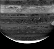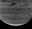 The most prominent feature seen in all three filters is the polar stratospheric haze that makes Jupiter bright near the pole. The equatorial band is also very bright in the strong 890-nm (right) image and to a lesser extent in the 727 band (middle image) but is subdued in the weak 619-nm image on the left. These are high, thin, haze layers that are nearly transparent at wavelengths outside the methane absorption bands. Another prominent feature is the Great Red Spot. About a third of it appears at the right-hand edge of the frame. It is a bright feature in methane absorption because it has extensive cloud cover reaching to high altitude. A wisp of high thin cloud can be seen trailing off its western rim in the middle and right images.