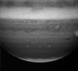 The images shown here demonstrate the power of these filters in studies of cloud stratigraphy. The images cover latitudes from about 15 degrees north at the top down to the southern polar region at the bottom. The left and middle images are ratios, the image in the methane filter divided by the image at a nearby wavelength outside the methane band. Using ratios emphasizes where contrast is due to methane absorption and not to other factors, such as the absorptive properties of the cloud particles, which influence contrast at all wavelengths.