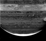 The opposite behavior is evident in an oval storm that appears dark in the middle and right images but is absent in the weak, 619-nm image. It is located to the southwest of the Great Red Spot. Further to the west at slightly more northerly latitudes are a series of small spots that are dark at all wavelengths. These and a myriad of other contrast features at many latitudes reveal much about Jupiter's complicated cloud structure and meteorology.