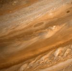 This image was obtained on June 29, 1979, when Voyager 2 was 9.3 million kilometers (5.6 million miles) from the planet. The view extends from +40 to -40 latitude with size of the smallest discernible features equal to 172 kilometers (106 miles). The broad, orange band extending across the lower half of the picture is the equatorial region of the planet. All brown and white oval-shaped clouds visible in this image were observed by Voyager 1 in early March, illustrating the stability of this type of feature in the Jovian atmosphere. The turbulent region in the lower right-hand corner lies to the west of the Great Red Spot. High velocity westward winds along the southern edge combine with eastern winds along the northern edge to produce the observed effect. These individual features are short-lived.