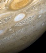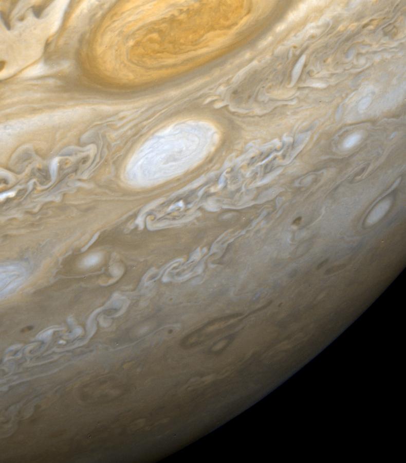 This picture shows a region of the southern hemisphere extending from the Great Red Spot to the south pole. The white oval is seen beneath the Great Red Spot, and several small scale spots are visible farther to the south. Some of these organized cloud spots have similar morphologies, such as anticyclonic rotations and cyclonic regions to their west. The presence of the white oval causes the streamlines of the flow to bunch up between it and the Great Red Spot.