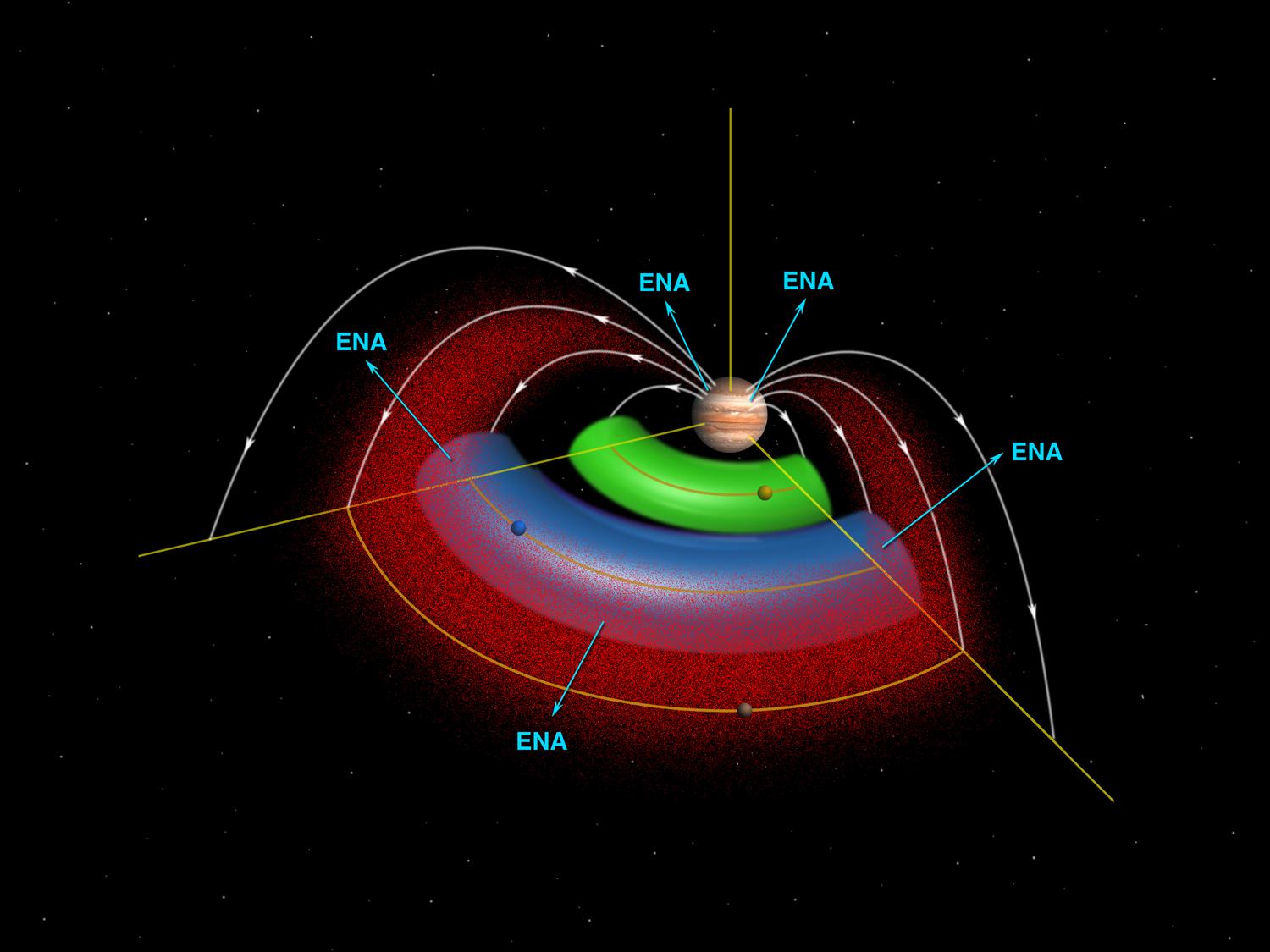 Energetic neutral atoms (ENA) are emitted from the Europa torus regions because of the interaction between the trapped ions and the neutral gases. The Magnetospheric Imaging Instrument on NASA's Cassini spacecraft imaged those energetic neutral atoms in early 2001 during Cassini's flyby of Jupiter. Energetic neutral atoms also come from Jupiter when radiation ions impinge onto Jupiter's upper atmosphere.