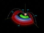 A cut-away schematic of Jupiter's space environment shows magnetically trapped radiation ions (in red), the neutral gas torus of the volcanic moon Io (green) and the newly discovered neutral gas torus of the moon Europa (blue). The white lines represent magnetic field lines.