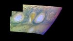 This mosaic uses the Galileo imaging camera's three near-infrared wavelengths (756 nanometers, 727 nanometers, and 889 nanometers displayed in red, green, and blue) to show variations in cloud height and thickness. Light blue clouds are high and thin, reddish clouds are deep, and white clouds are high and thick. The clouds and haze over the White Ovals are high, extending into Jupiter's stratosphere. There is a lack of high haze over the cyclonic feature. Dark purple most likely represents a high haze overlying a clear deep atmosphere. Galileo is the first spacecraft to distinguish cloud layers on Jupiter.