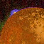 This picture shows a special color reconstruction of one of the erupting volcanos on Io discovered by Voyager 1 during its encounter with Jupiter on the 4th and 5th of March. The picture was taken March 4 about 5:00 p.m. from a range of about half a million kilometers showing an eruption region on the horizon. This method of color analysis allows scientists to combine data from four pictures, taken in ultraviolet, blue, green and orange light. In this picture one can see the strong change in color of the erupting plume. The region that is brighter in ultraviolet light (blue in this image) is much more extensive than the denser, bright yellow region near the center of the eruption. Scientists will use data of this type to study the amount of gas and dust in the eruption and the size of dust particles. Preliminary analysis suggests that the bright ultraviolet part of the cloud may be due to scattered light from very fine particles (the same effect which makes smoke appear bluish).