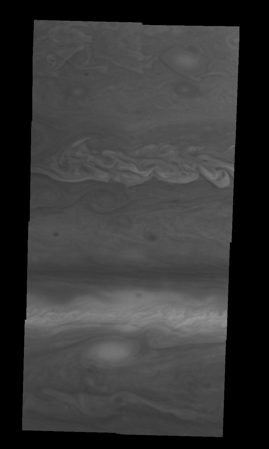 Mosaic of Jupiter's northern hemisphere between 10 and 50 degrees latitude. Jupiter's atmospheric circulation is dominated by alternating eastward and westward jets from equatorial to polar latitudes. The direction and speed of these jets in part determine the color and texture of the clouds seen in this mosaic. Also visible are several other common Jovian cloud features, including large white ovals, bright spots, dark spots, interacting vortices, and turbulent chaotic systems. The north-south dimension of each of the two interacting vortices in the upper half of the mosaic is about 3500 kilometers. Light at 410 nanometers is affected by the sizes and compositions of cloud particles, as well as the trace chemicals that give Jupiter's clouds their colors. This mosaic shows the features of Jupiter's main visible cloud deck and the hazy cloud layer above it.