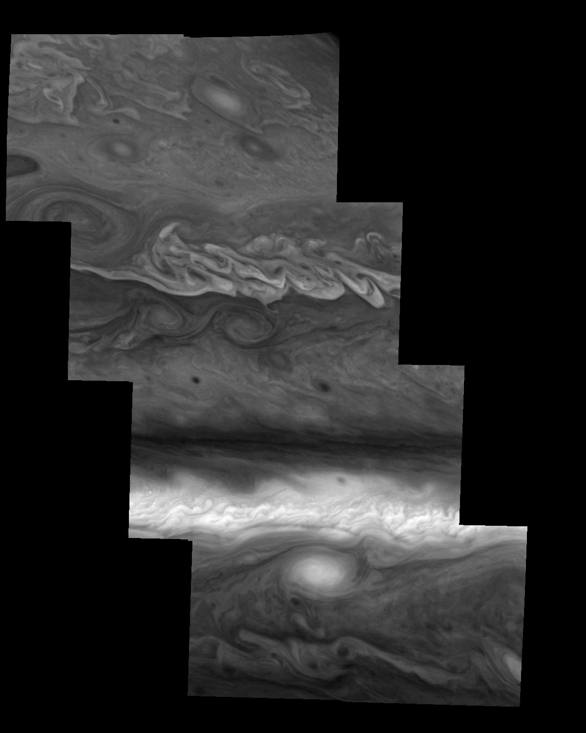 Mosaic of Jupiter's northern hemisphere between 10 and 50 degrees latitude. Jupiter's atmospheric circulation is dominated by alternating eastward and westward jets from equatorial to polar latitudes. The direction and speed of these jets in part determine the color and texture of the clouds seen in this mosaic. Also visible are several other common Jovian cloud features, including large white ovals, bright spots, dark spots, interacting vortices, and turbulent chaotic systems. The north-south dimension of each of the two interacting vortices in the upper half of the mosaic is about 3500 kilometers. Light at 410 nanometers is affected by the sizes and compositions of cloud particles, as well as the trace chemicals that give Jupiter's clouds their colors. This mosaic shows the features of Jupiter's main visible cloud deck and the hazy cloud layer above it.