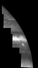 North is at the top. The images are projected on a sphere, with features being foreshortened towards the north. The planetary limb runs along the right edge of the mosaic. Cloud patterns appear foreshortened as they approach the limb. The smallest resolved features are tens of kilometers in size. These images were taken on April 3, 1997, at a range of 1.4 million kilometers by the Solid State Imaging system (CCD) on NASA's Galileo spacecraft.
