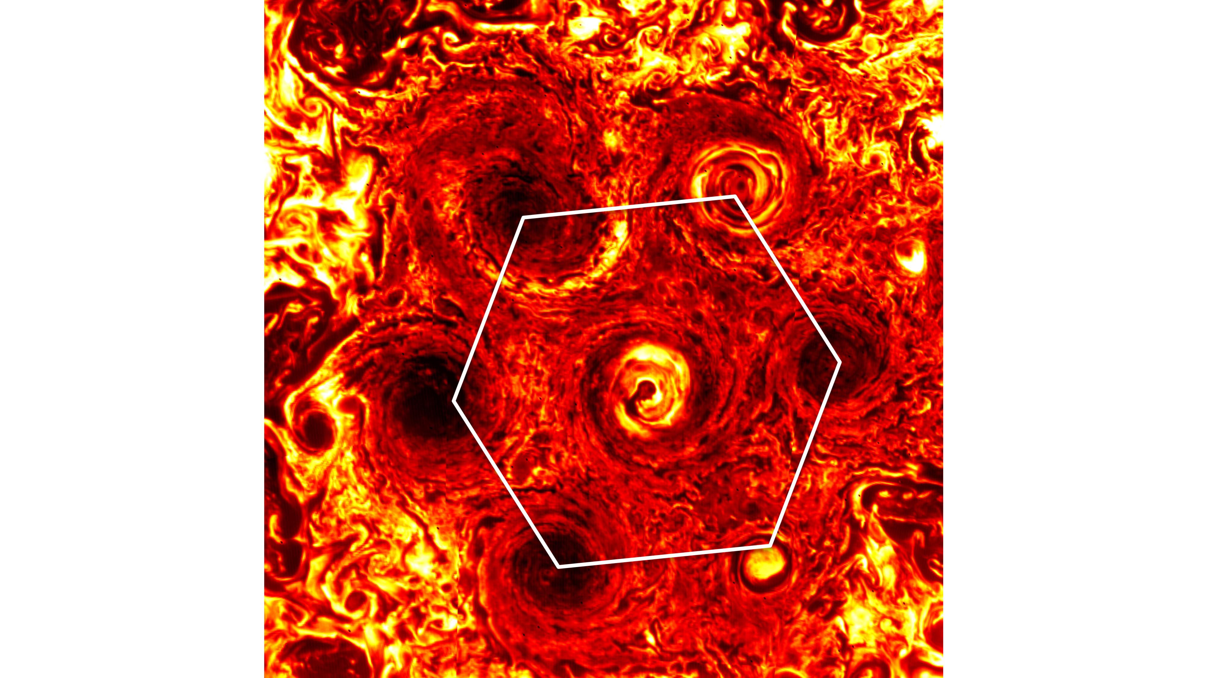 In this annotated infrared image, six cyclones form a hexagonal pattern around a central cyclone at Jupiter's south pole. The image was generated from data collected on Nov. 4, 2019, by the Jovian Infrared Auroral Mapper (JIRAM) instrument aboard NASA's Juno mission during its 23rd science pass of the planet. The JIRAM instrument measures heat radiated from the planet at an infrared wavelength of around 5 microns.
