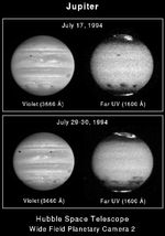 These four NASA Hubble Space Telescope images of Jupiter, as seen in visible (violet) and far-ultraviolet (UV) wavelengths, show the remarkable spreading of the clouds of smoke and dust thrown into the atmosphere after the impacts of the fragments of comet P/Shoemaker-Levy 9. These dark regions provide the only information ever obtained on the wind direction and speed in Jupiter's upper atmosphere.