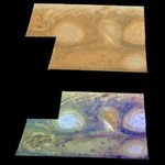 The lower mosaic uses the Galileo imaging camera's three near-infrared wavelengths (756 nanometers, 727 nanometers, and 889 nanometers displayed in red, green, and blue) to show variations in cloud height and thickness. Light blue clouds are high and thin, reddish clouds are deep, and white clouds are high and thick. The clouds and haze over the white ovals are high, extending into Jupiter's stratosphere. There is a lack of high haze over the cyclonic feature. Dark purple most likely represents a high haze overlying a clear deep atmosphere. Galileo is the first spacecraft to distinguish cloud layers on Jupiter.